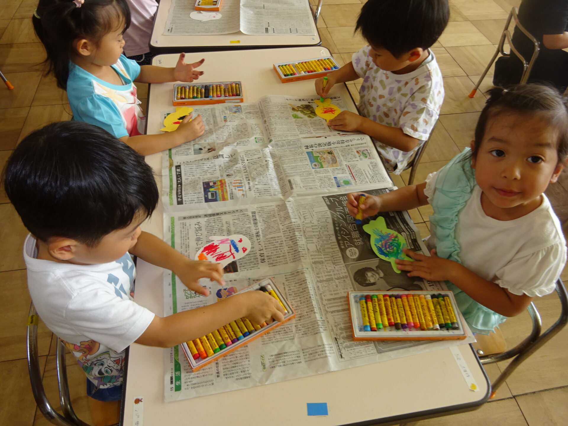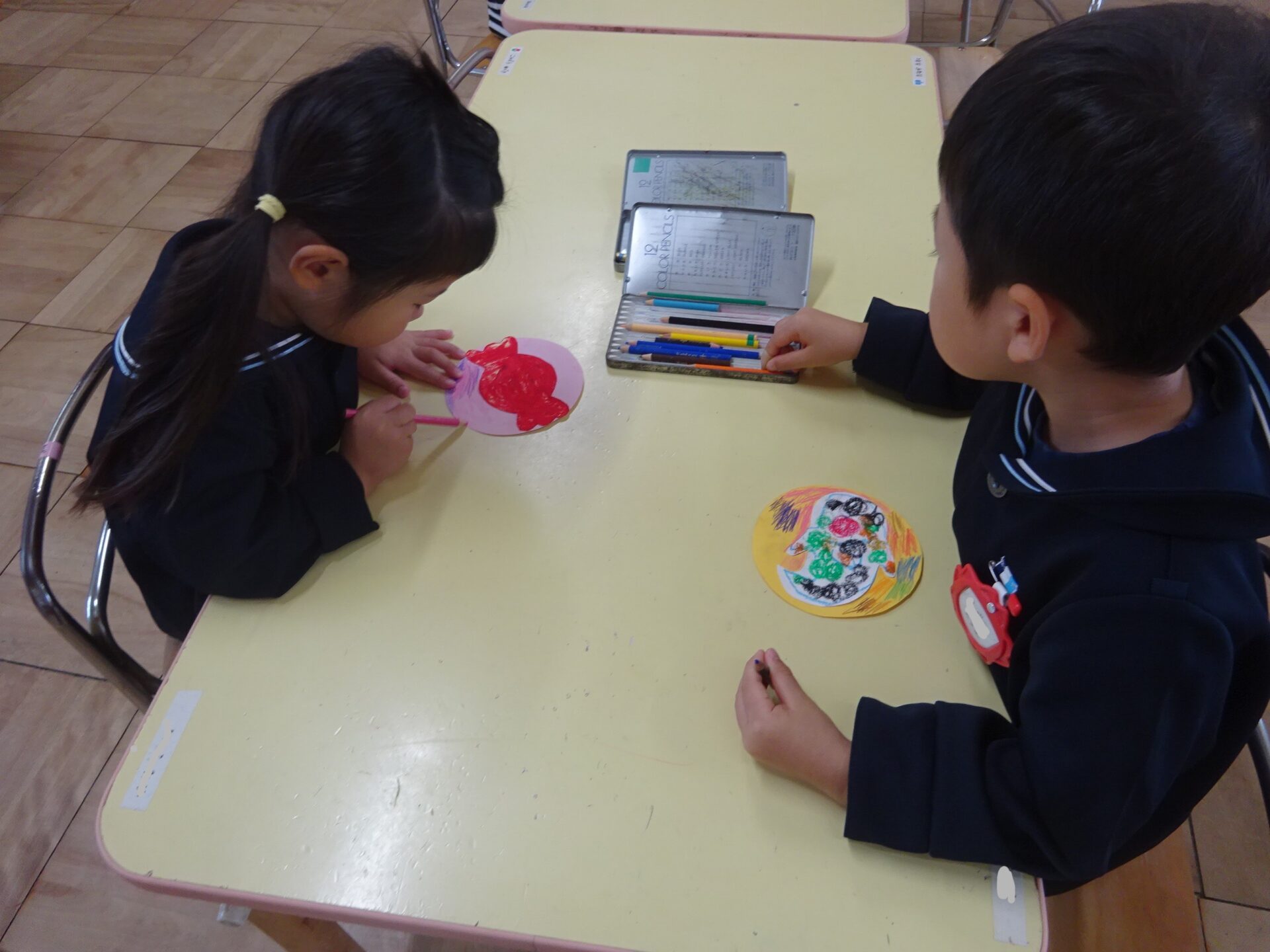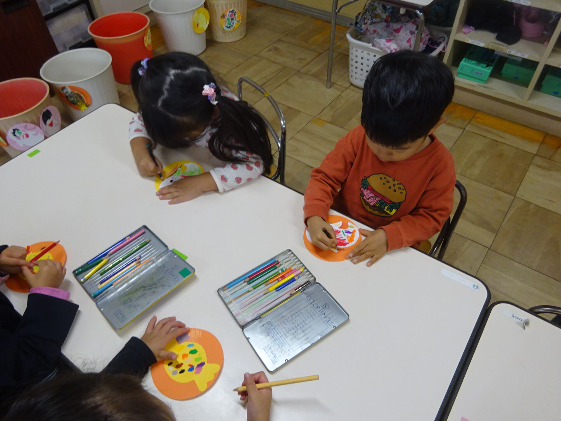 ・色鉛筆で周りに飾りつけ!カラフルにしたりと夢中で塗る子どもたちです♪