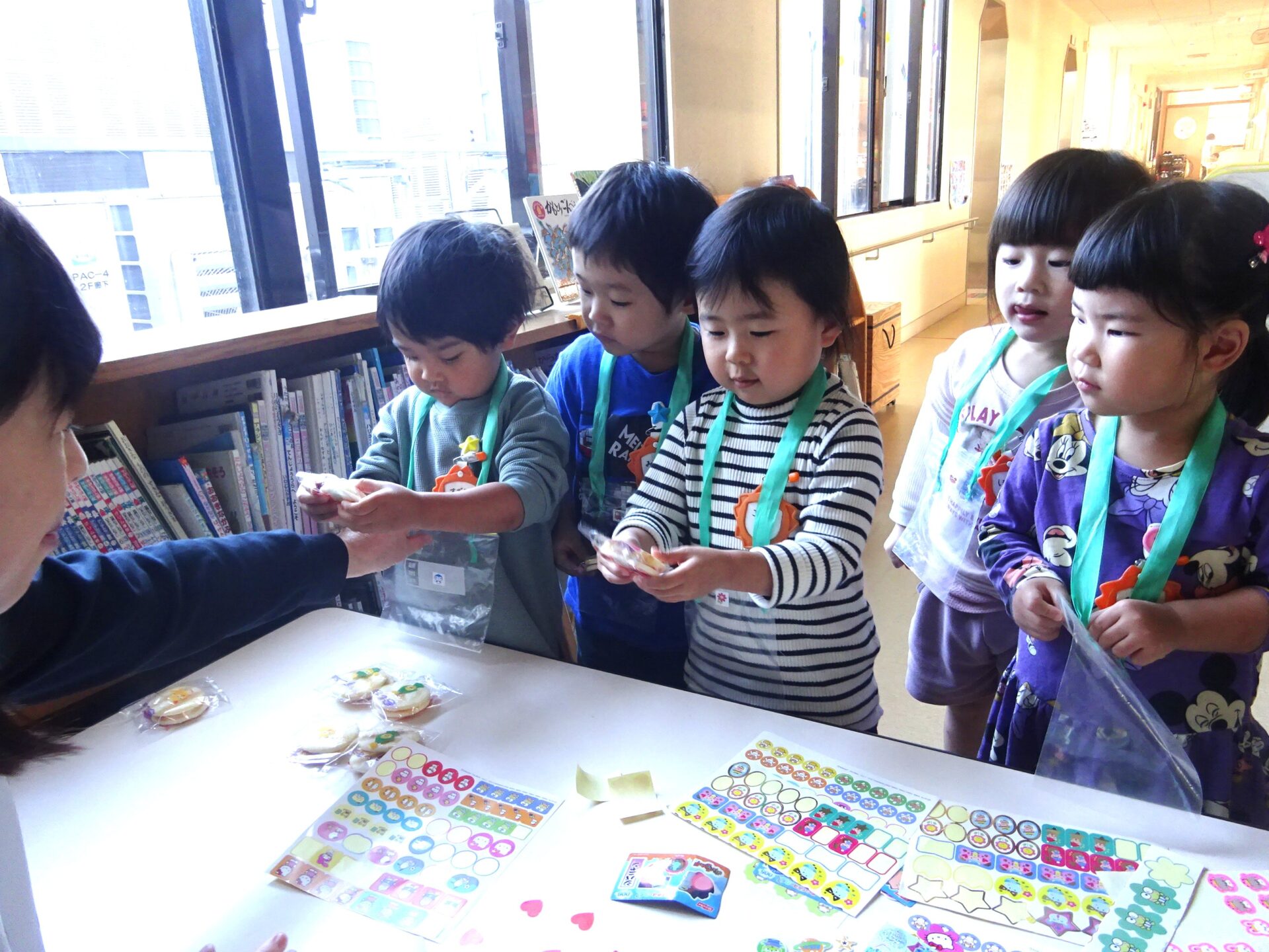 ・散歩に持っていくおやつをお店屋さんにもらいにきたよ!好きなシール選べるんだよ♪