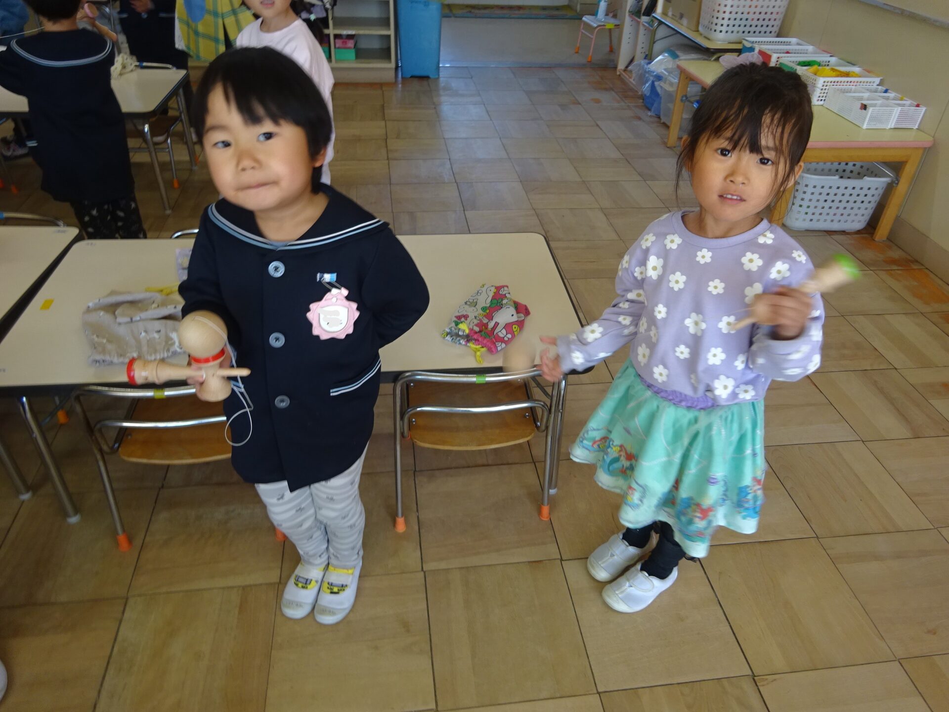 ・持ち方もばっちり(*^^*)足をしっかりと曲げてけん玉に取り組んでいます!