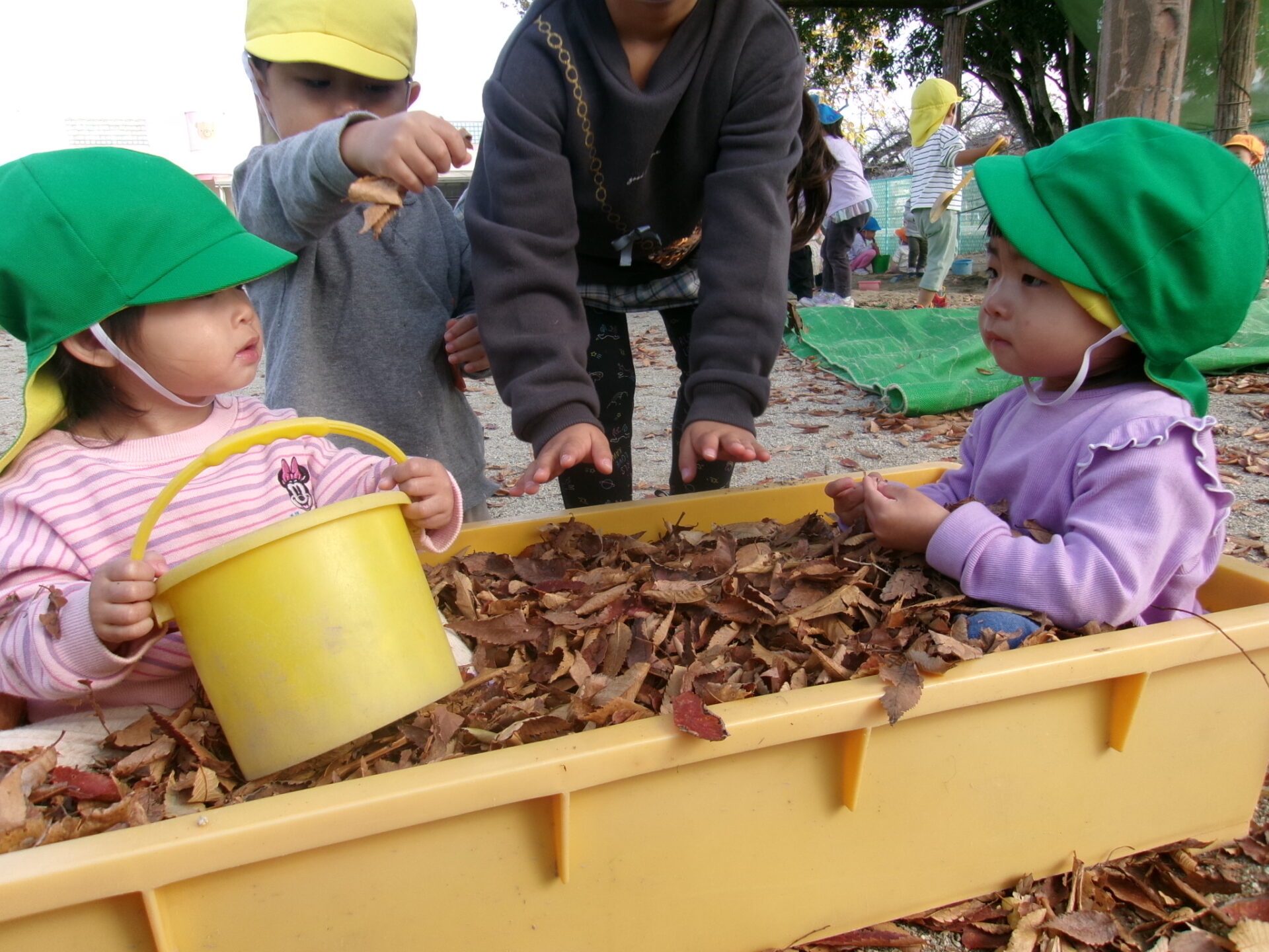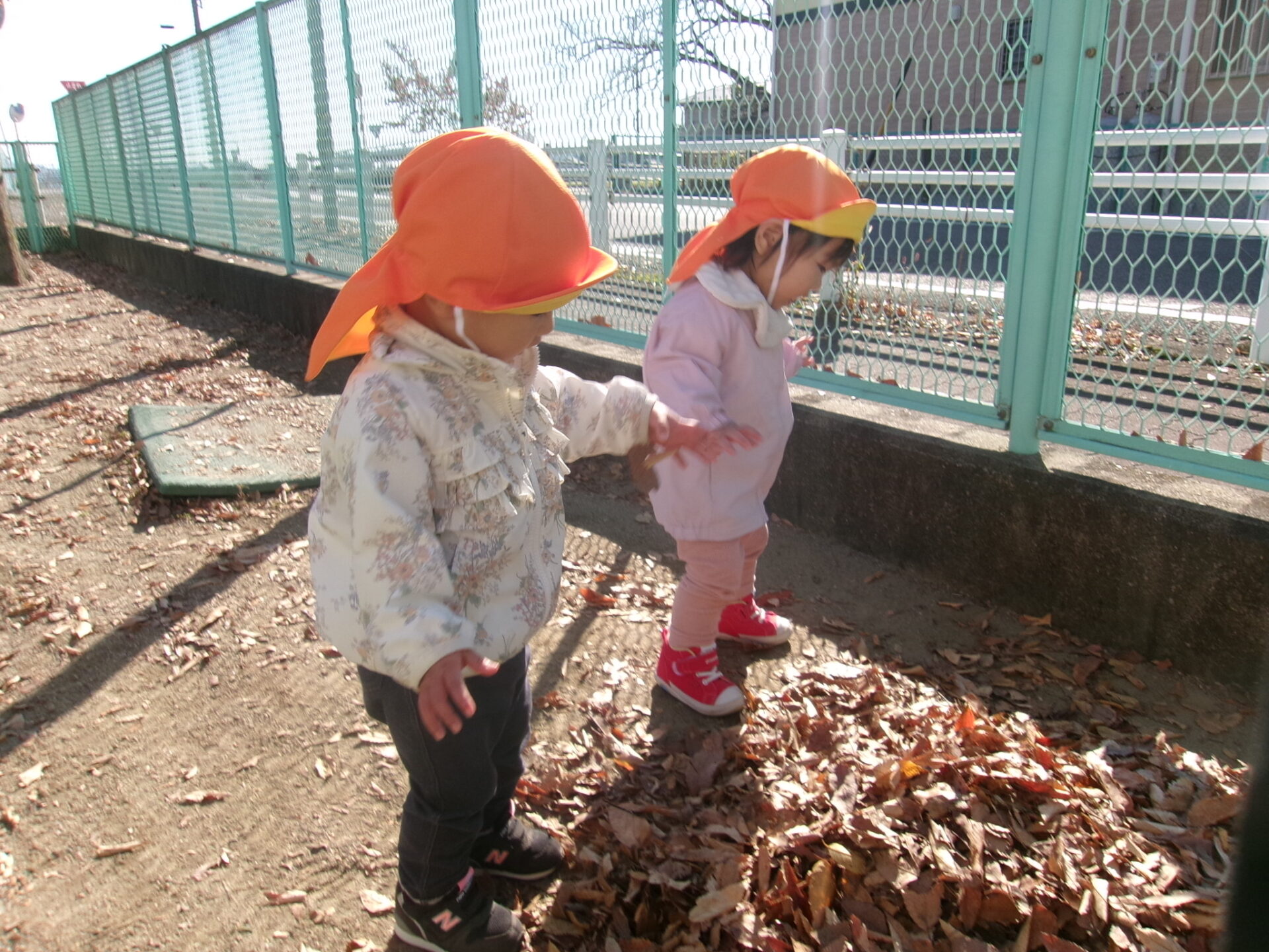 ・「ヒラヒラ~」と落ち葉を降らしたり、手で触って感触を楽しんでいる子ども達です♪