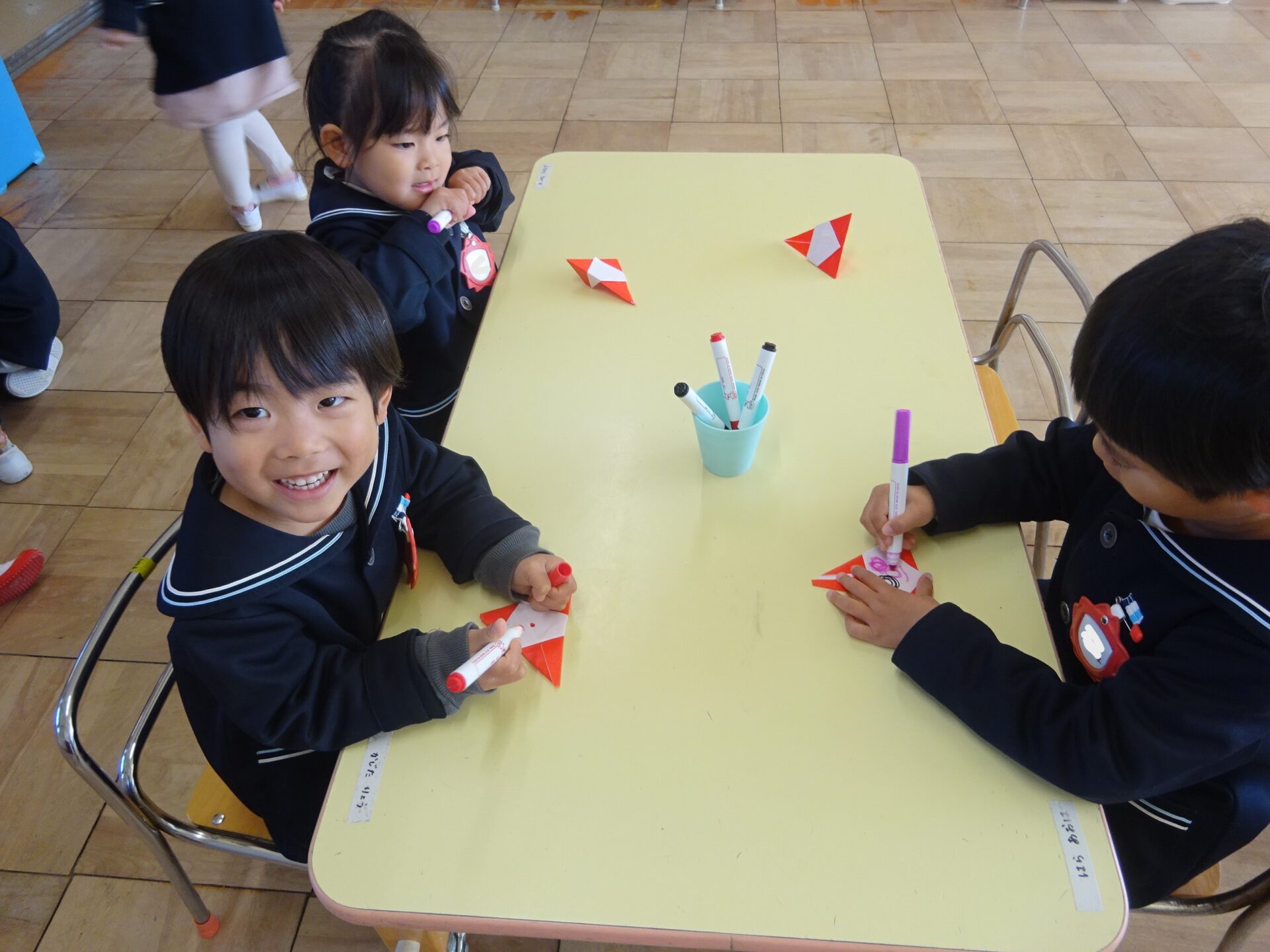 ・折り紙では笑った顔、赤鼻の顔など素敵なサンタさんが出来ました☆