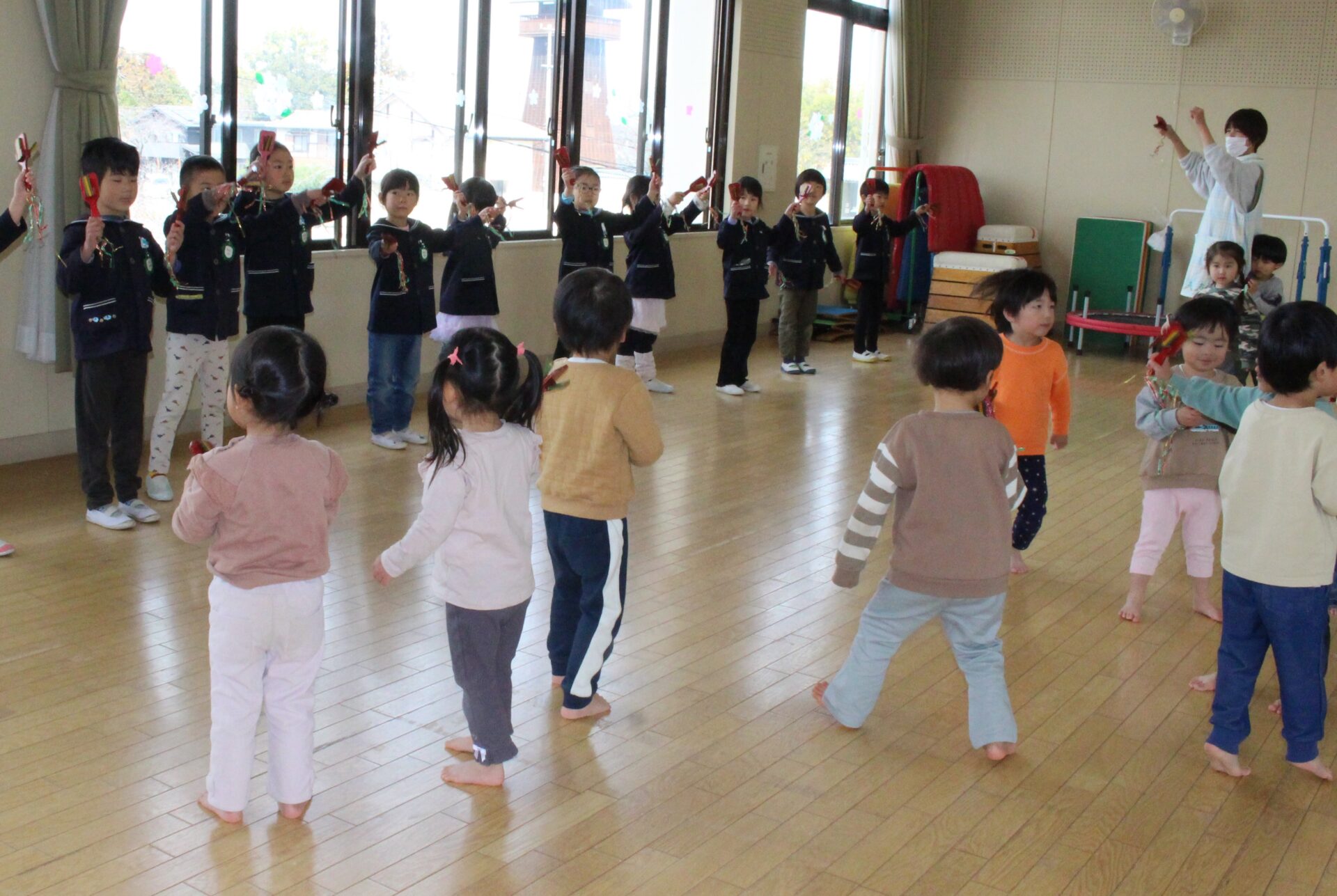 ・運動会で披露した鳴子のお手本を見せてもらって、あひる組さんも一緒に踊りました♪