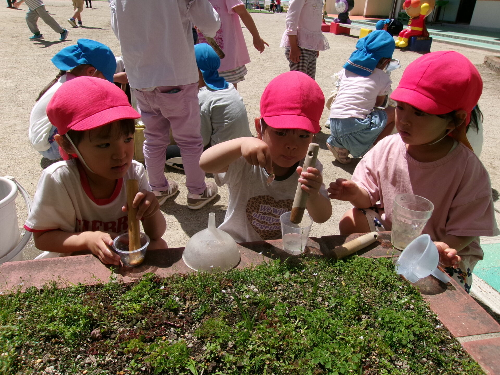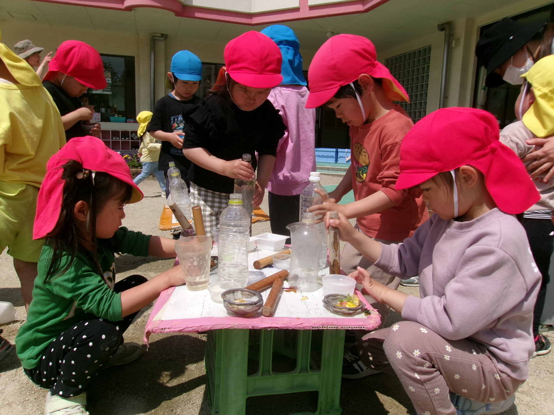 ・花や葉っぱをすり潰して色水遊び!楽しくて真剣になる子ども達。